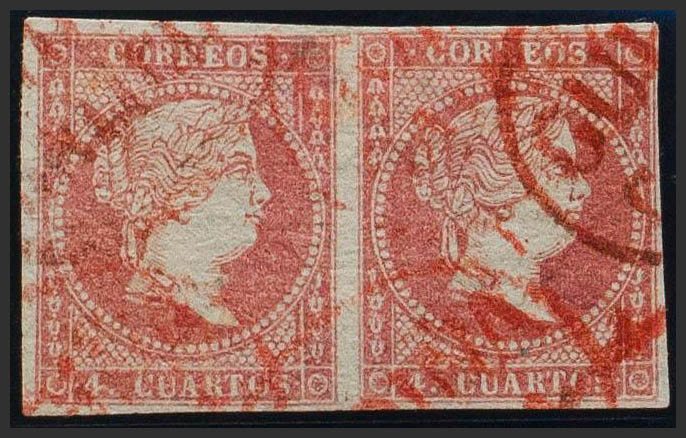 English 44(2). 1856. 4 cuartos red, pair. Pre-philatelic postmark GUDIÑA / GALICIA, in red. MAGNIFICENT AND EXTRAORDINARILY RARE. Certificate GRAUS.