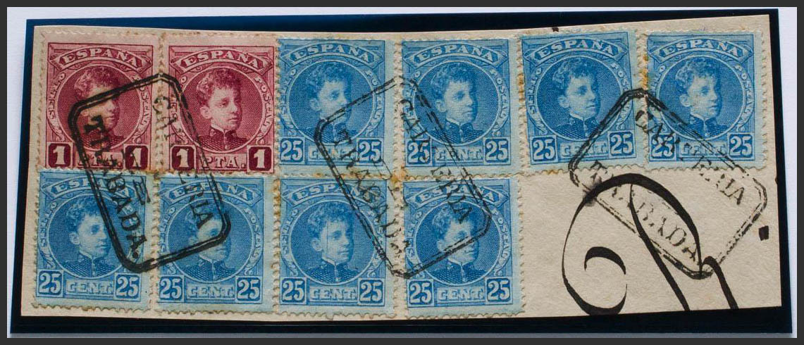 △ 248(8), 253(2). 1901. 25 blue cts, eight stamps and 1 carmine pts, two stamps, on fragment. Special postmark CARTERIA / DE TRABADA, from Lugo. MAGNIFICENT AND VERY RARE, TRULY SPECTACULAR.