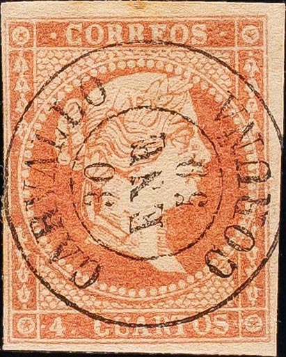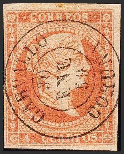 48. 1855. 4 cuartos red. Postmark CARVALLO / CORUÑA. MAGNIFICENT AND RARE.