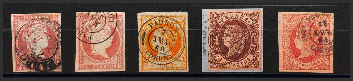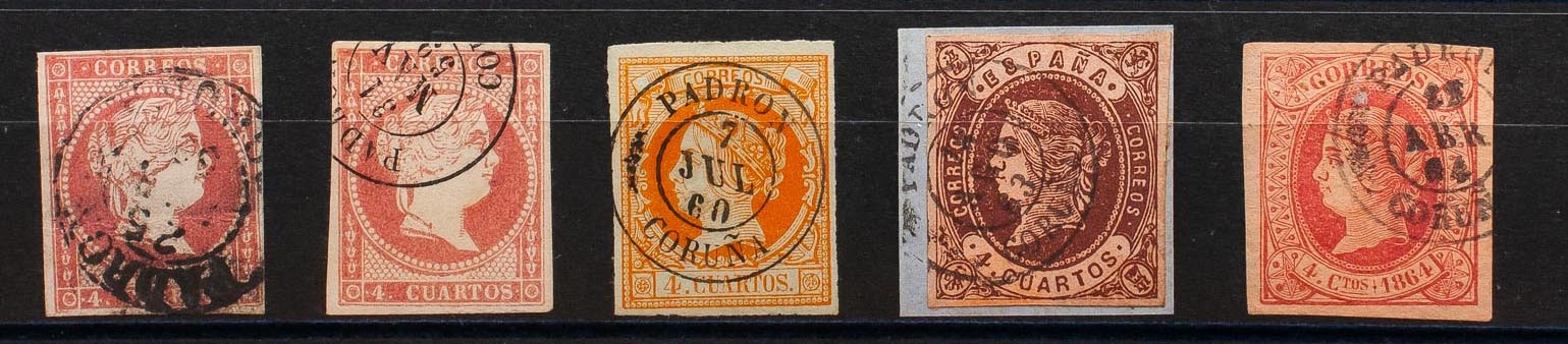 48(2), 52, 58, 64. (1855ca). Set of five 4- cuartos red, yellow, brown and pink stamps, unused with the PADRON / CORUÑA postmark (including Type I on the 4- cuartos red). MAGNIFICENT.