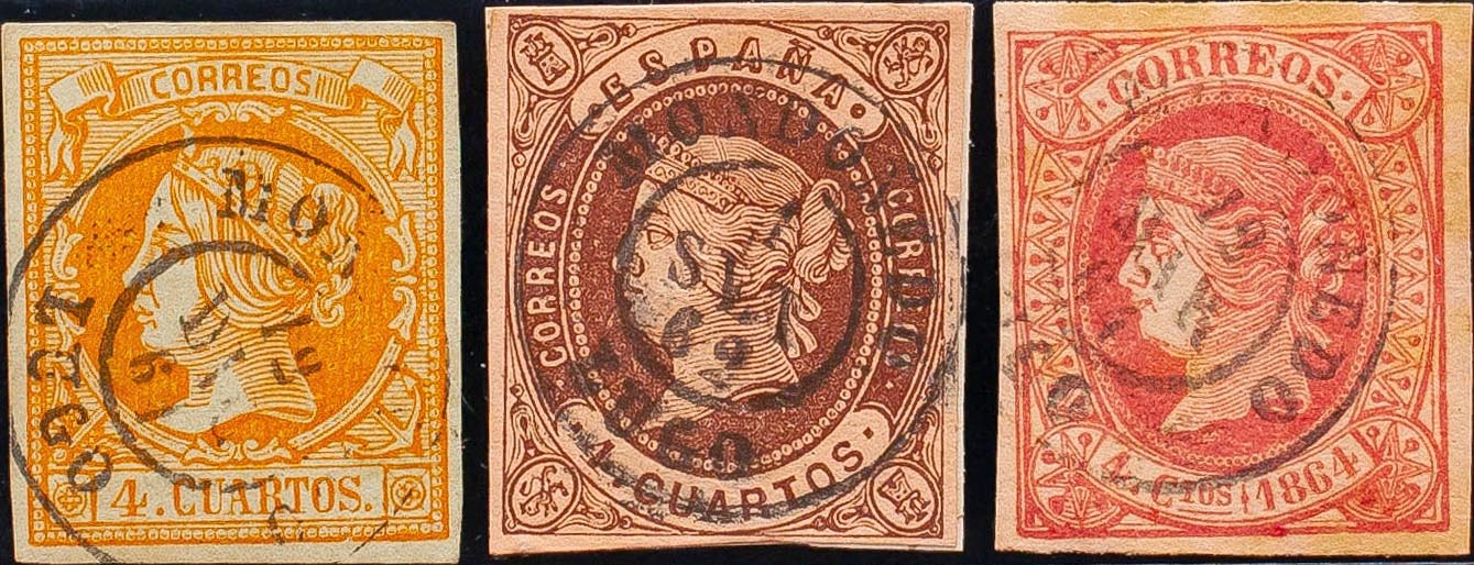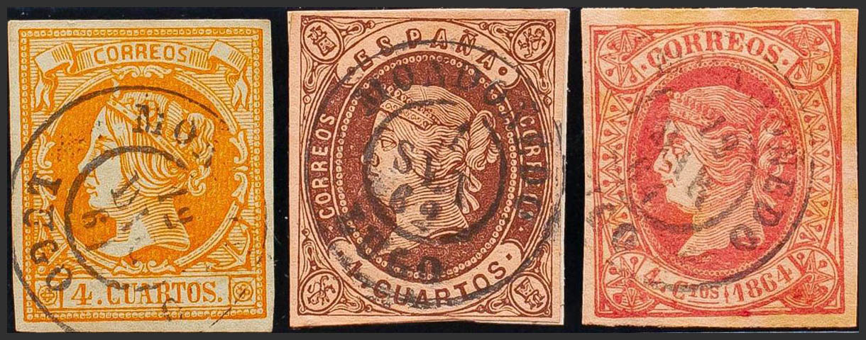 52, 58, 64. (1860ca). Set of three 4- cuartos yellow, brown and pink stamps, unused with the MONDOÑEDO / LUGO postmark. MAGNIFICENT.