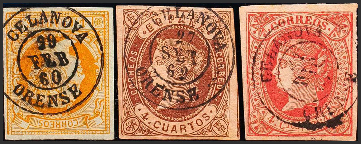52, 58, 64. (1860ca). Set of three 4- cuartos yellow, brown and pink stamps, unused with the CELANOVA / ORENSE postmark. MAGNIFICENT.