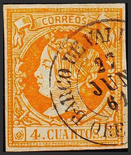 52. 1860. 4 cuartos yellow. Postmark BARCO DE VALDEORRAS / ORENSE. MAGNIFICENT.