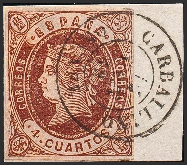 △ 58. 1862. 4 chestnut cuartos , on fragment. Postmark CARBALLINO / ORENSE. MAGNIFICENT AND RARE.
