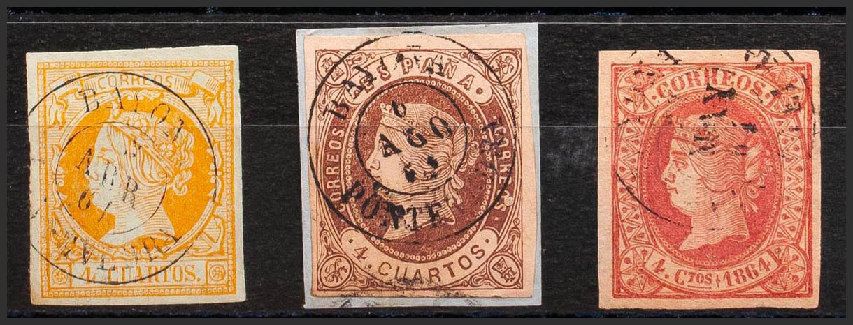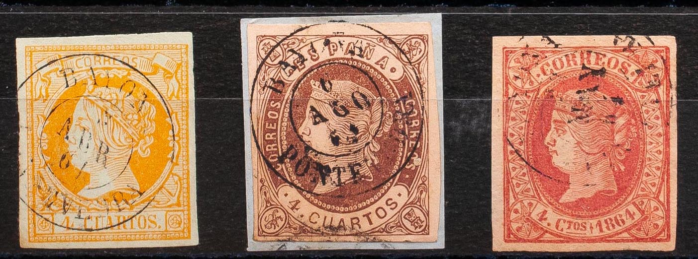 52, 58, 64. (1860ca). Set of three 4- cuartos yellow, brown and pink stamps, unused with the BAYONA / PONTEVEDRA postmark. MAGNIFICENT.