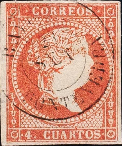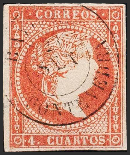 48. 1855. 4 cuartos red. Postmark BAYONA / PONTEVEDRA. BEAUTIFUL AND RARE.