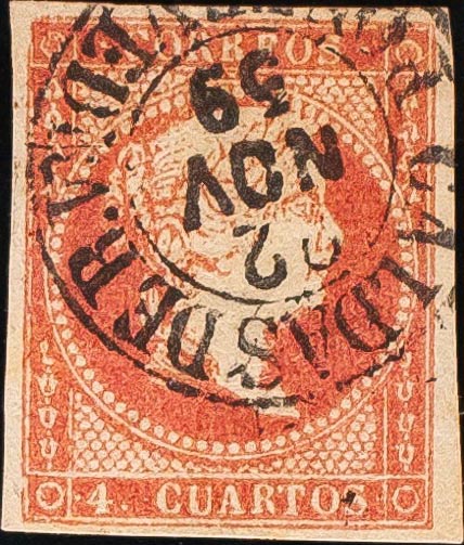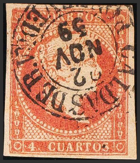 48. 1855. 4 cuartos red. Postmark CALDAS DE R. / PONTEVEDRA (Type I). MAGNIFICENT.