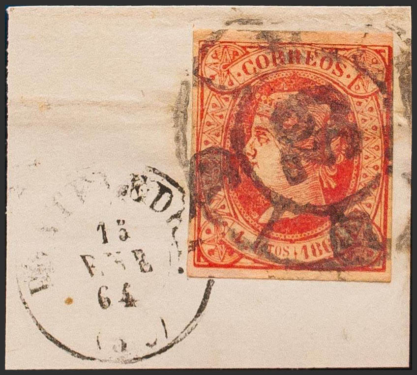 △ 64. 1864. 4 pink cuartos , on fragment. Mixed postmark R.CARRETA Nº39 and date stamp PONTEVEDRA / (39). MAGNIFICENT.