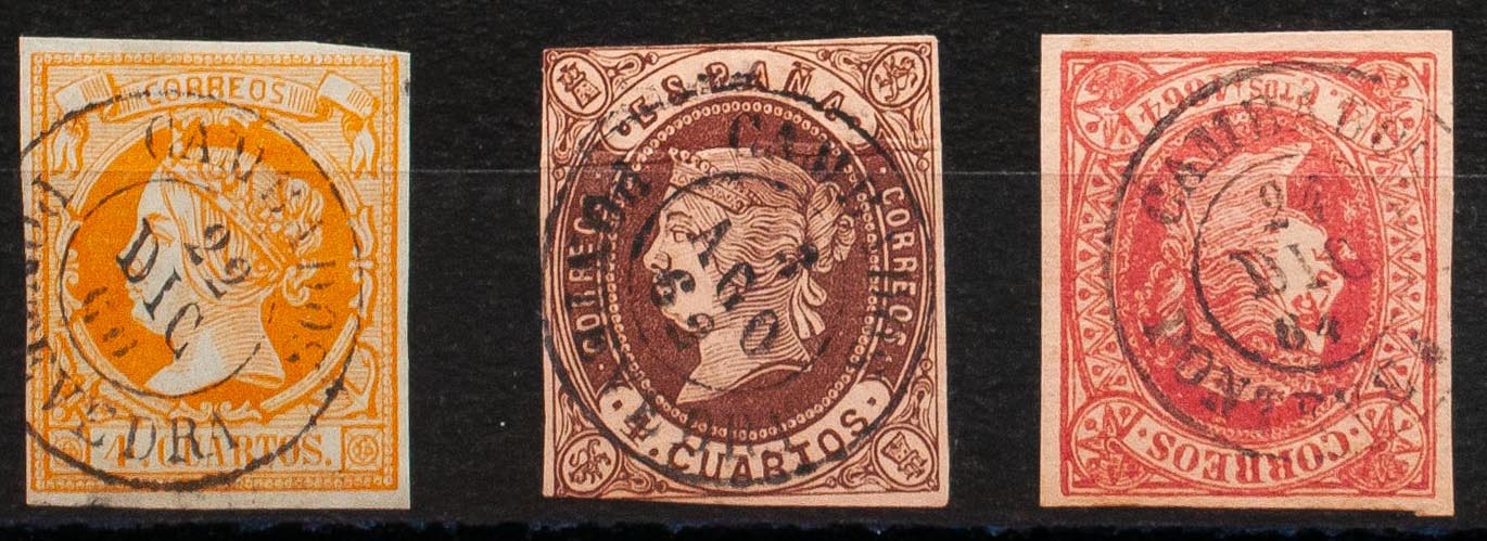 English 52, 58, 64. (1860ca). Set of three 4- cuartos yellow, brown and pink stamps, unused with the CAMBADOS / PONTEVEDRA postmark. MAGNIFICENT.