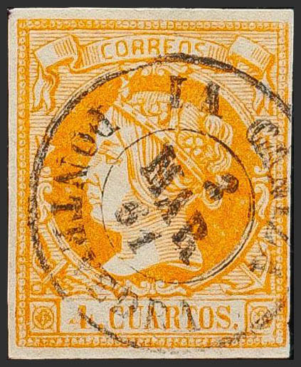 52. 1860. 4 cuartos yellow. Postmark LA CAÑIZA / PONTEVEDRA. MAGNIFICENT AND RARE.