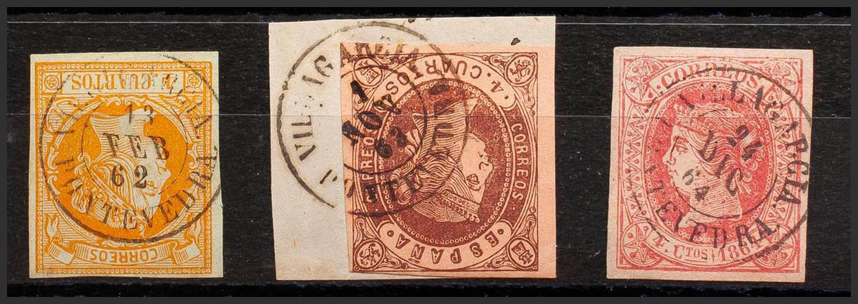 52, 58, 64. (1860ca). Set of three 4- cuartos yellow, brown and pink stamps, unused with the VILLAGARCIA / PONTEVEDRA postmark. MAGNIFICENT.