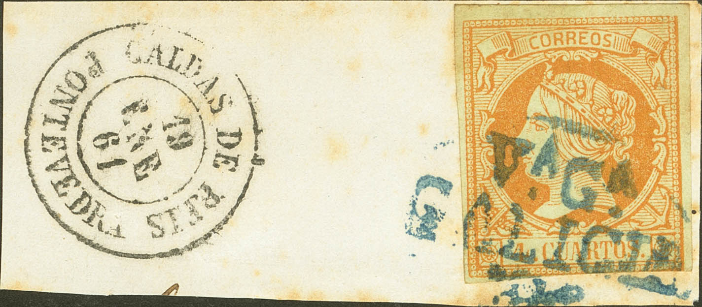 |fragment| 52. 1861. 4 orange quarters. Pre-philatelic postmark VªGª / GALICIA, in blue. MAGNIFICENT.