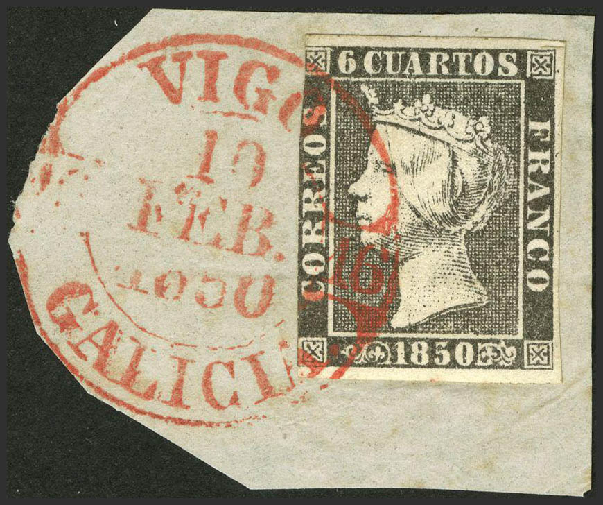 △ 1. 1850. 6 cuartos black, on fragment. Postmark baeza VIGO / GALICIA. MAGNIFICENT