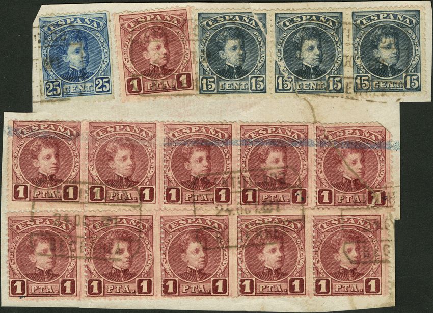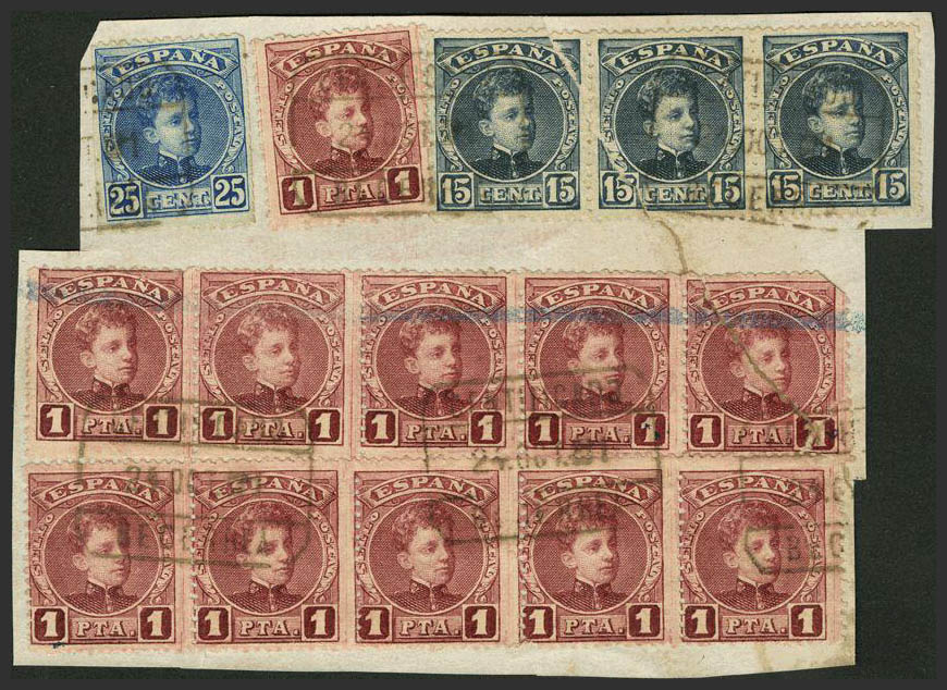 △ 244(3), 248, 253(11). 1901. 15 cts, three stamps, 25 cts and 1 pts eleven stamps, on fragment. CERTIFICADO / BECERREA postmark, repaired break that affects three stamps. MAGNIFICENT.