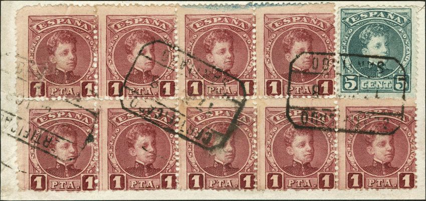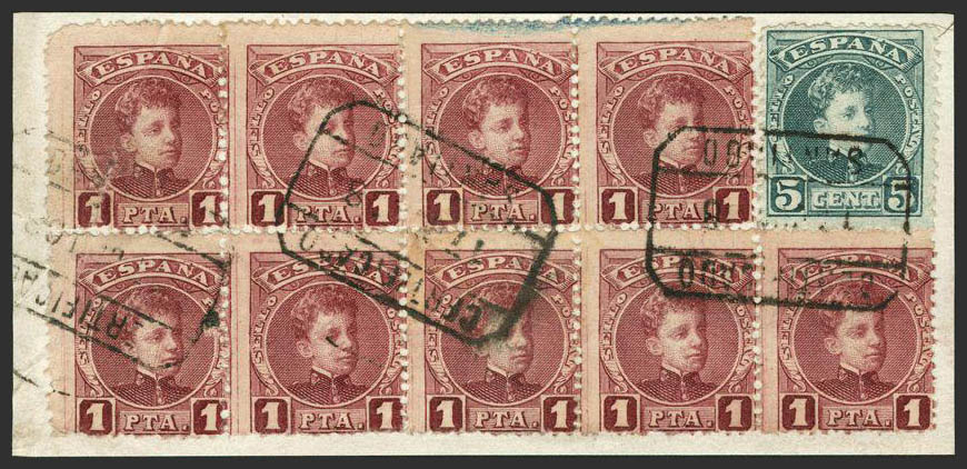 △ 242, 253(9). 1901. 5 cts and 1 pts, nine stamps, on fragment. CERTIFIED postmark / SANTIAGO. MAGNIFICENT.