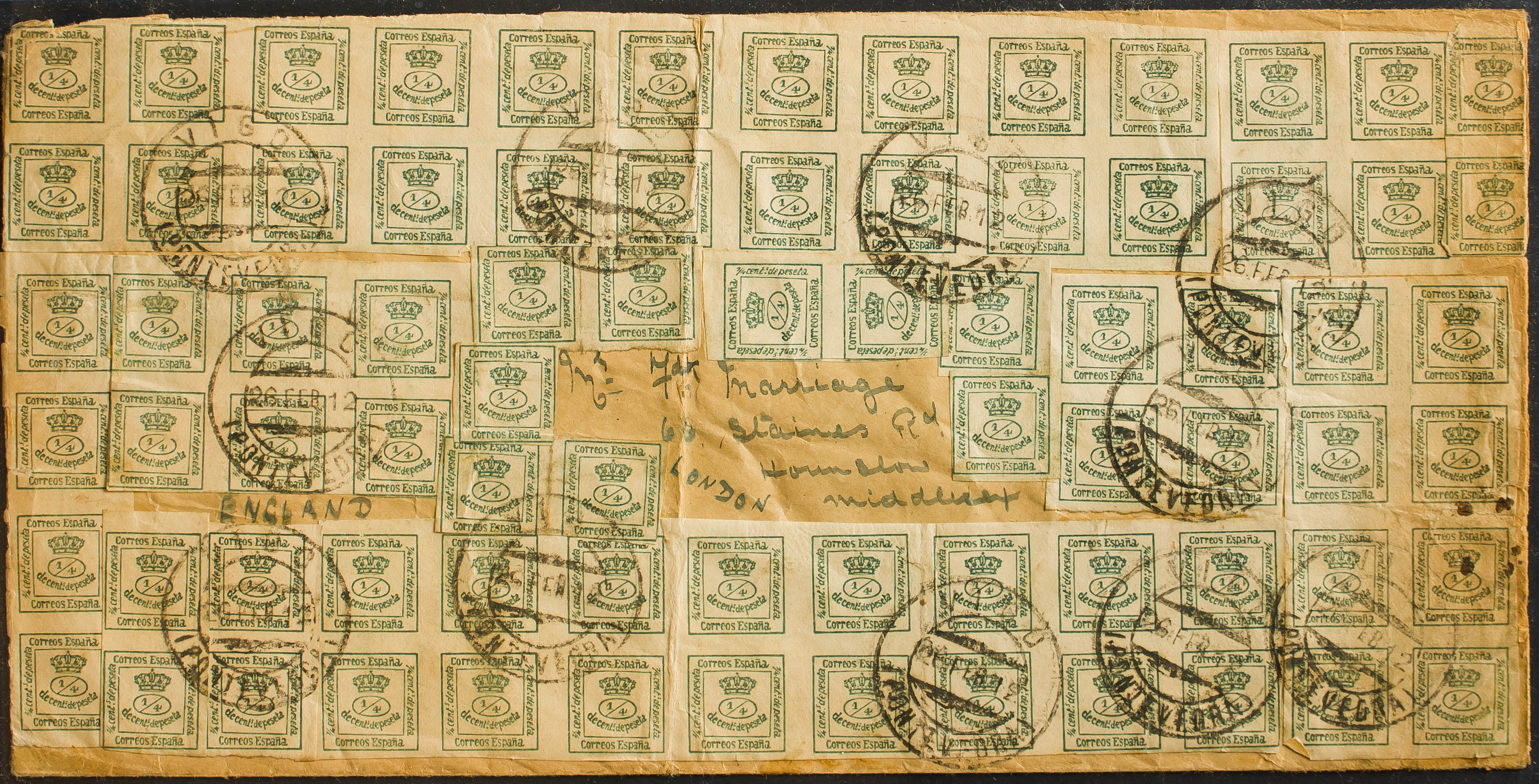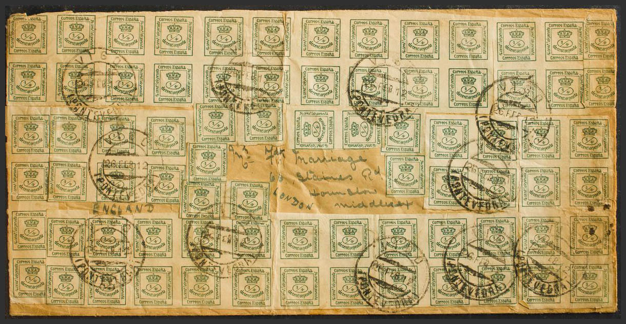 173(25). 1912. 1/4 cts green, hundred stamps. VIGO to MIDBURY (ENGLAND). Postmark VIGO / PONTEVEDRA. MAGNIFICENT AND SPECTACULAR POSTAGE.