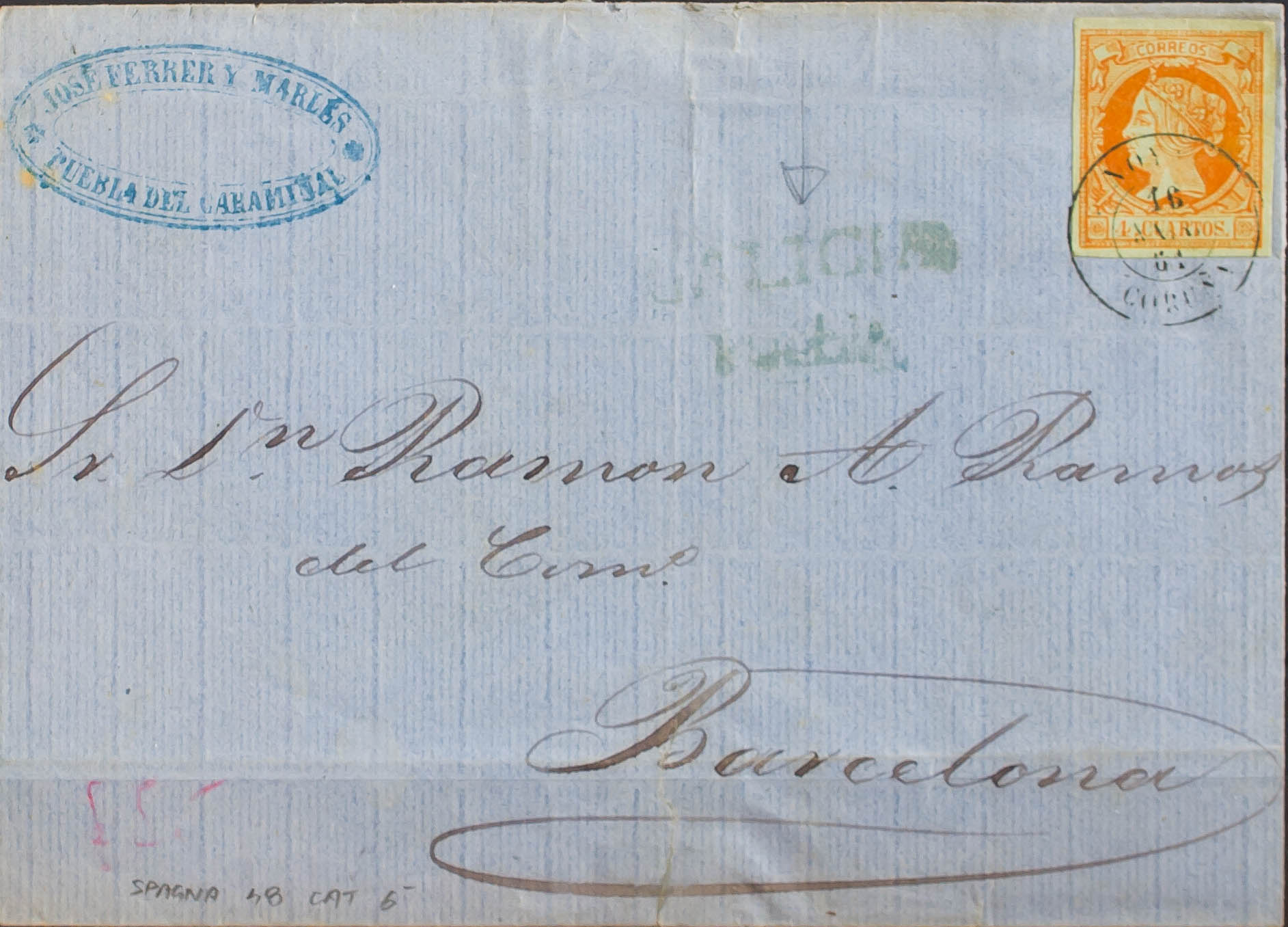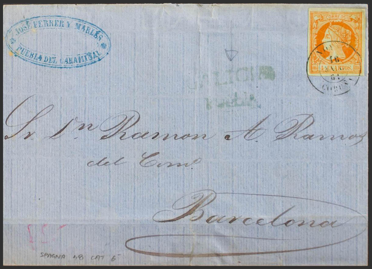 52. 1861. 4 orange cuartos . PUEBLA DE CARAMIÑAL to BARCELONA. Postmark NOYA / CORUÑA, on the front mark GALICIA / PUEBLA, in greenish blue. MAGNIFICENT AND RARE.
