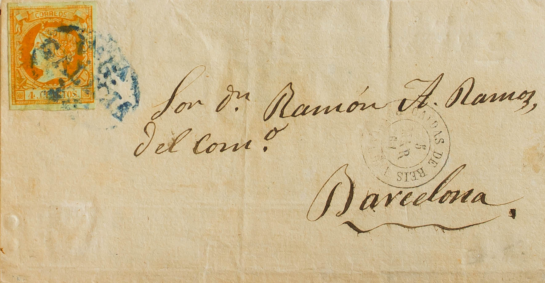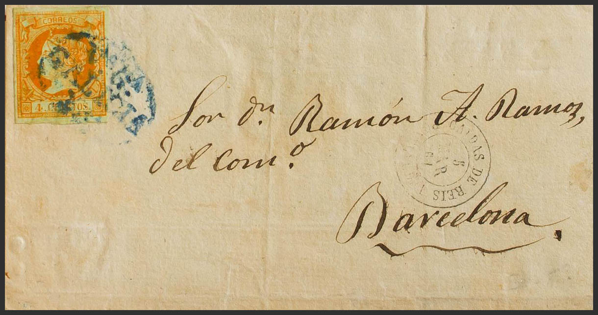 52. 1861. 4 cuartos yellow. CALDAS DE REIS to BARCELONA. Pre-philatelic postmark Vª Gª / GALICIA, in blue. MAGNIFICENT AND VERY RARE, ESPECIALLY IN THIS QUALITY. Certificate GRAUS.