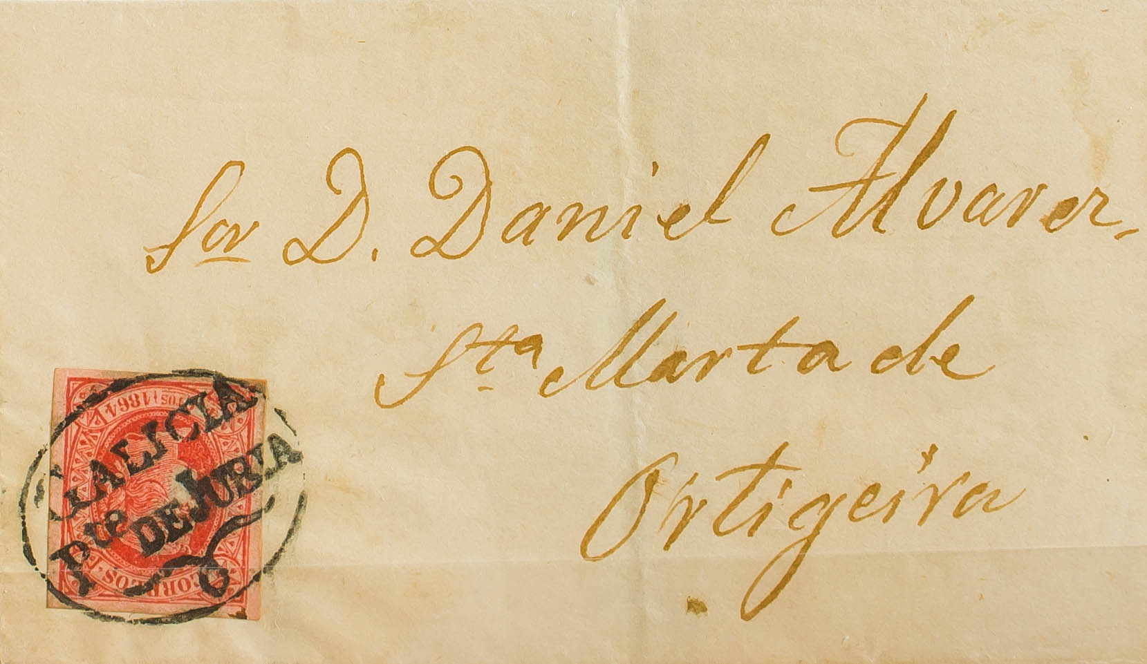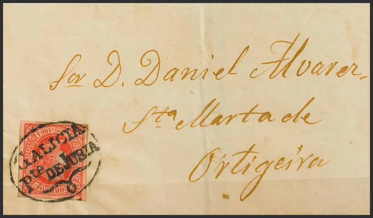64. 1864. 4 red cuartos . BRIDGE FROM JUBIA TO ORTIGUEIRA. Pre-philatelic postmark GALICIA / PTE. OF JUBIA. MAGNIFICENT AND VERY RARE, ESPECIALLY WITH THIS EXCEPTIONAL STAMPING. Certificate COMEX.