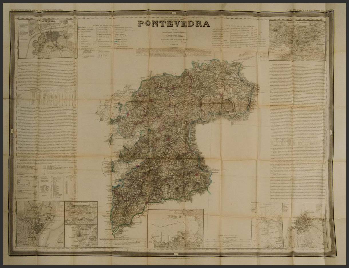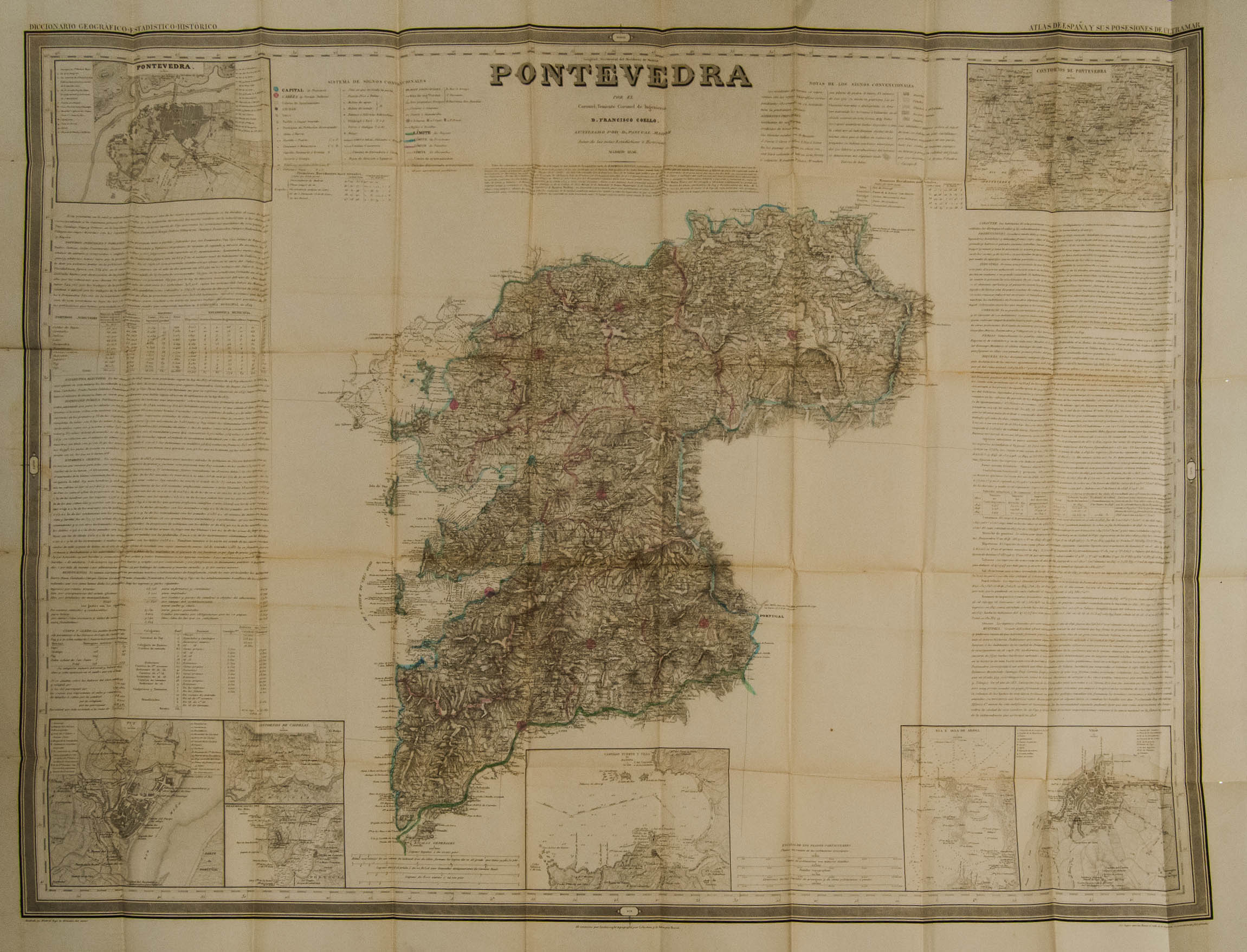 1856. ATLAS OF SPAIN AND ITS OVERSEAS POSSESSIONS, Francisco Coello. Corresponding to the province of PONTEVEDRA and in the hardcover edition of 1853 (map and folder), historical, administrative data, etc. and the plans of the largest cities in the province at that time are included. MAGNIFICENT AND UNUSUAL MAP OF THE PERIOD OF ISABEL II, WHICH INCLUDES ALL THE POST ROUTES OF THE PERIOD, IDEAL FOR THE STUDY OF THE POSTAL HISTORY OF THE COLLECTOR OF THIS REGION, THIS WORK HAS ALWAYS BEEN PRESENT IN THE GREAT SPANISH PHILATELIC LIBRARIES SUCH AS THOSE OF MONGE, CLIMBING, TIZON, GALVEZ. Ex-GRAUS.