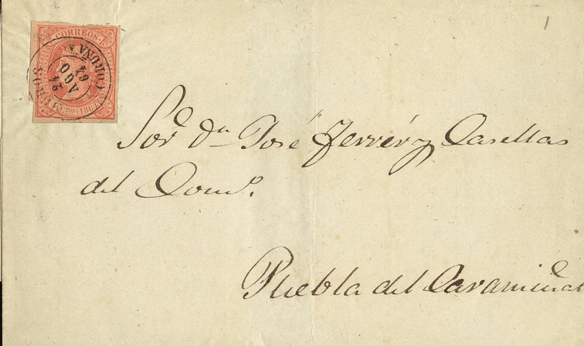 64. 1864. 4 red cuartos . WALLS to PUEBLA DE CARAMIÑAL. Postmark MUROS / CORUÑA. MAGNIFICENT.