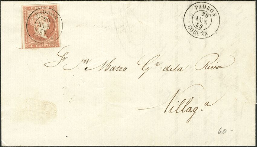 48. 1856. 4 red cuartos . PADRON to VILLAGARCIA. Postmark PADRON / CORUÑA. MAGNIFICENT.