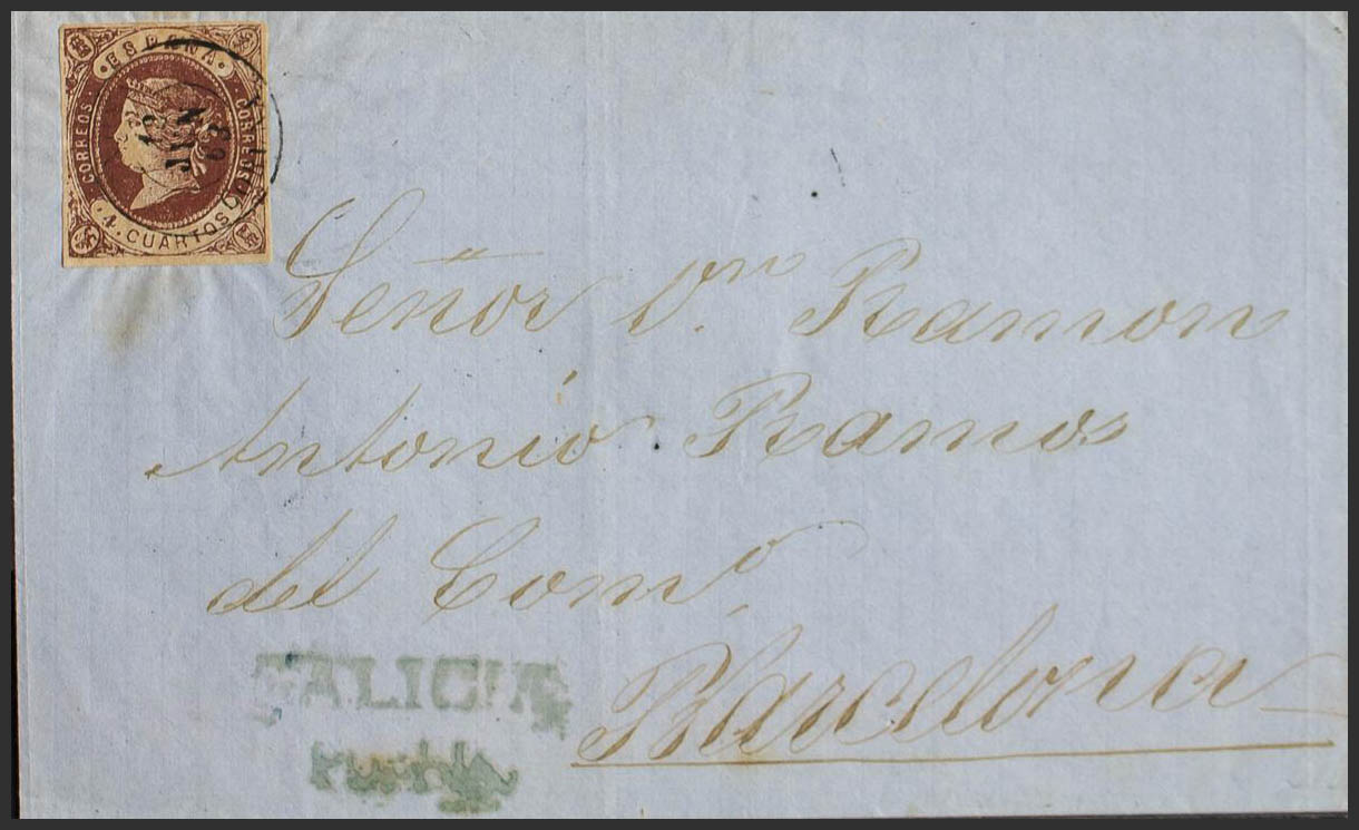 58. 1863. 4- cuartos chestnut. PUEBLA DEL CARAMIÑAL to BARCELONA. Postmark NOYA / CORUÑA, on the front pre-philatelic mark GALICIA / PUEBLA, in blue. MAGNIFICENT AND UNUSUAL.