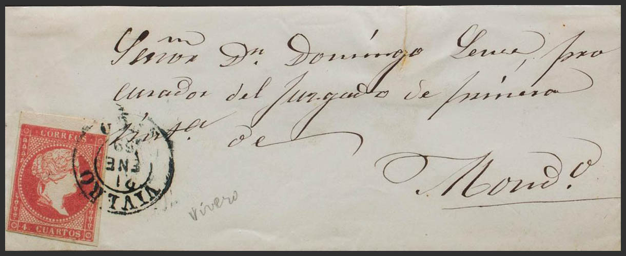 48. 1859. 4 red cuartos . Nursery front to MONDOÑEDO. Postmark VIVERO / LUGO (Type I). MAGNIFICENT AND RARE.