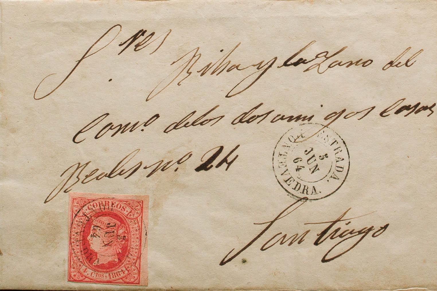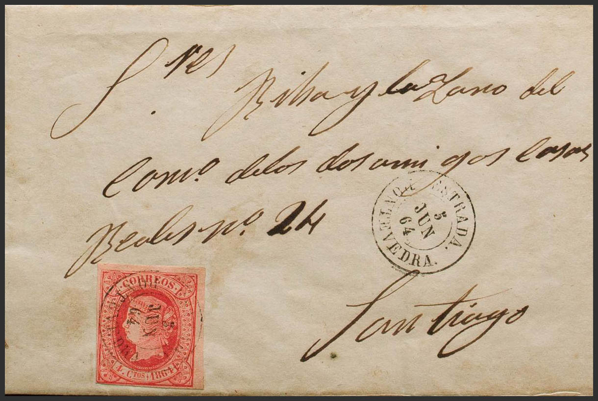 64. 1864. 4 red cuartos . ROAD to SANTIAGO. Postmark ESTRADA / PONTEVEDRA. MAGNIFICENT AND VERY RARE.