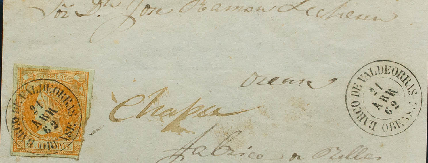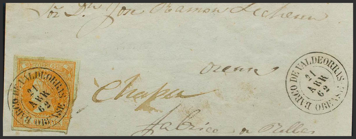 52. 1860. 4 orange cuartos . Front of BARCO DE VALDEORRAS to ORENSE. Postmark BOAT FROM VALDEORRAS / ORENSE. MAGNIFICENT.