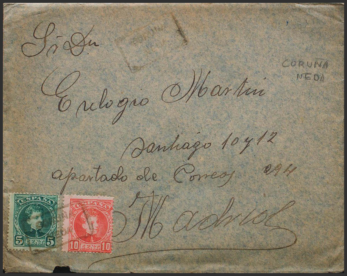 242, 243. 1906. 5 cts green and 10 cts red. NEDA to MADRID. Postmark special mail CORUÑA / NEDA. MAGNIFICENT AND RARE.