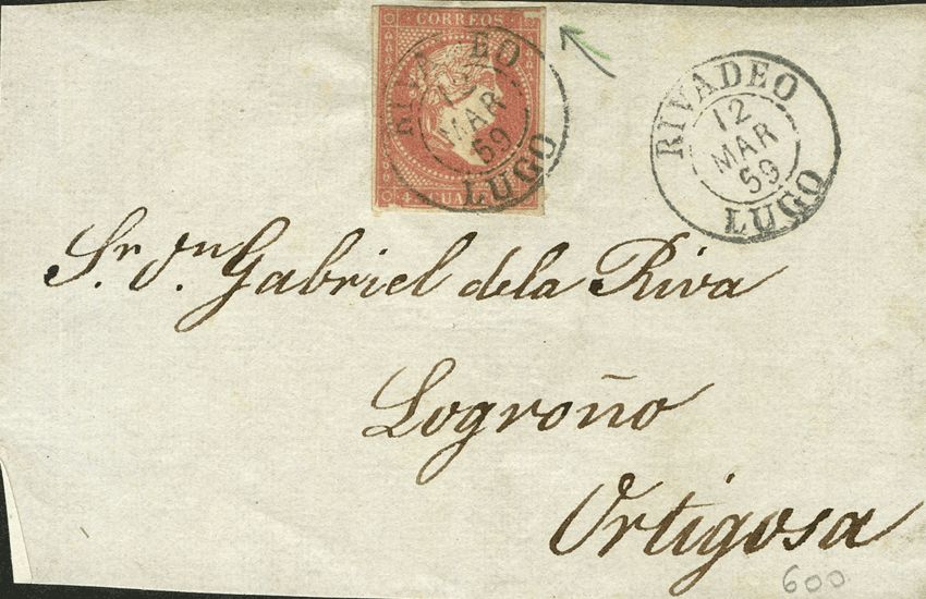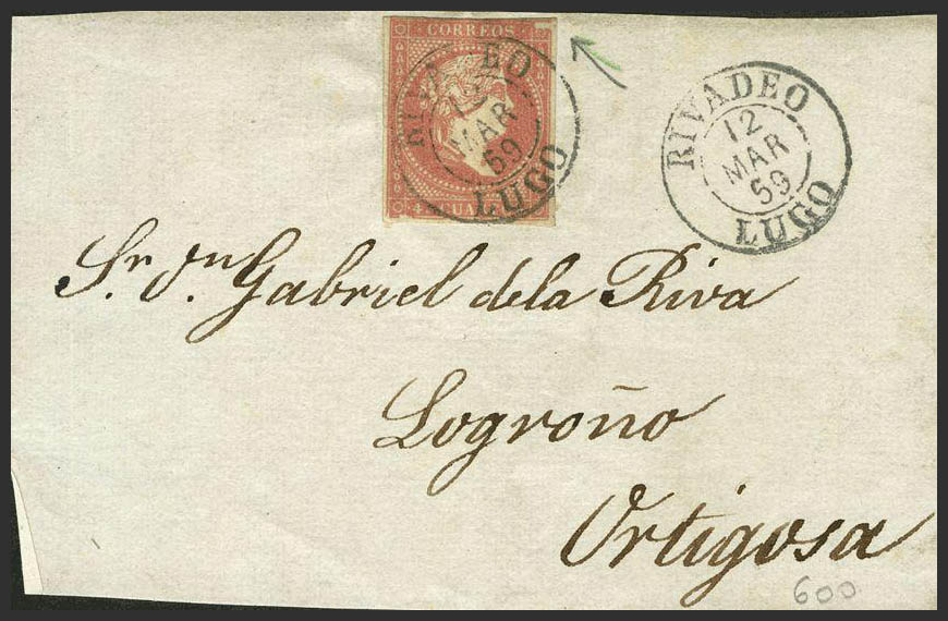 48. 1856. 4 red cuartos . Front from RIVADEO to ORTIGOSA. Postmark RIVADEO / LUGO (Type I). MAGNIFICENT.