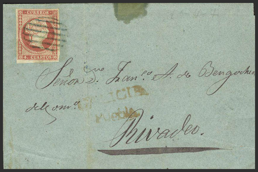 48. 1857. 4 red cuartos . PUEBLA to RIVADEO. Postmark PARRILLA, in blue, next to pre-philatelic mark GALICIA / PUEBLA, in red. MAGNIFICENT AND RARE.