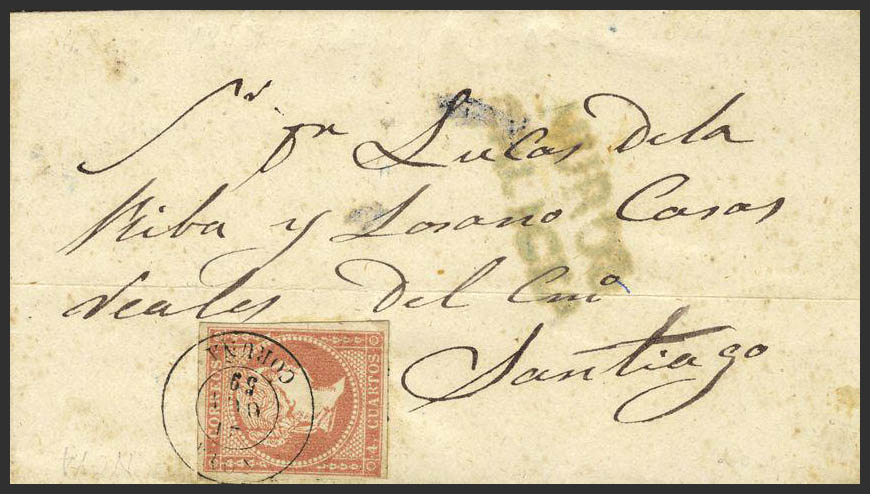 48. 1859. 4 red cuartos . NOYA to SANTIAGO. Postmark NOYA / CORUÑA, next to pre-philatelic mark MUROS / GALICIA, in blue.