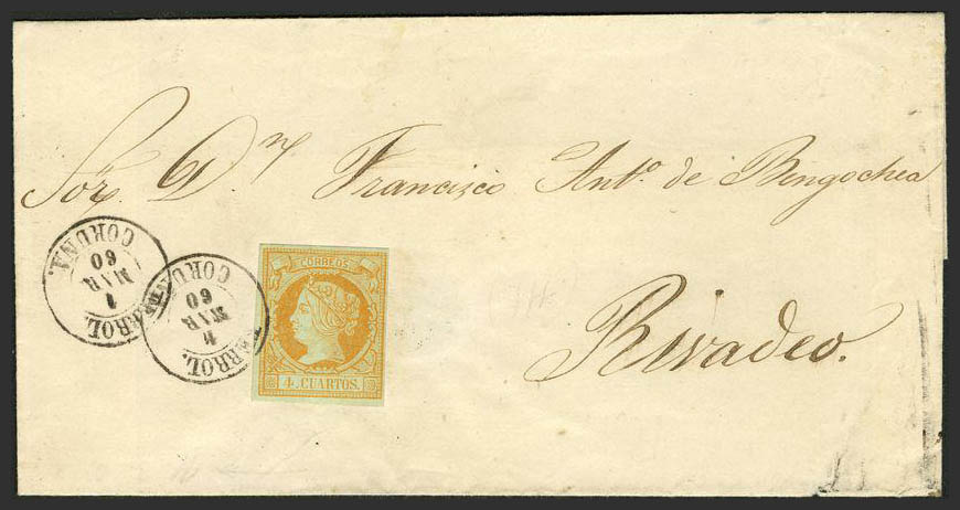 English 52. 1860. 4 cuartos yellow. FERROL to RIVADEO. Postmark FERROL / CORUÑA. MAGNIFICENT.