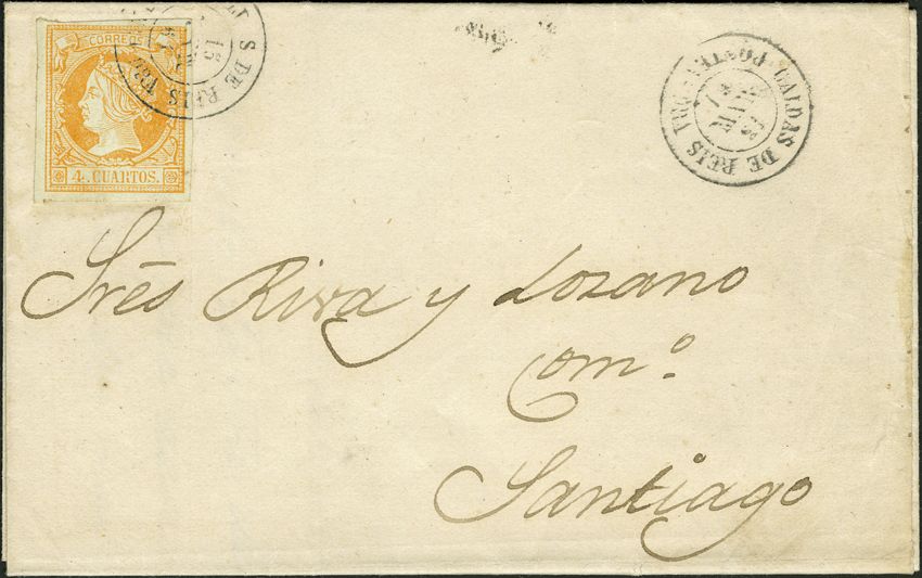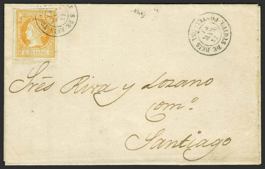 52. 1861. 4 cuartos yellow. CALDAS DE REIS to SANTIAGO. Postmark CALDAS DE REIS / SANTIAGO.