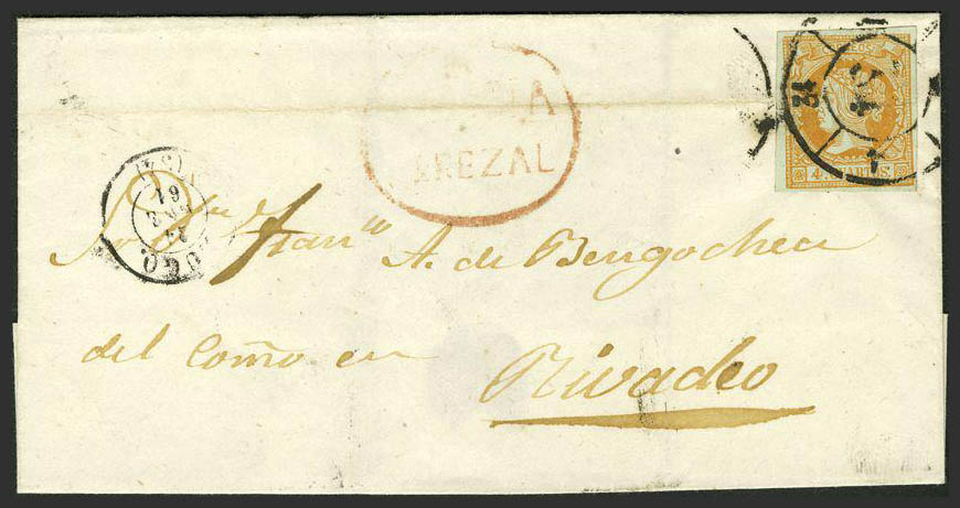 52. 1861. 4 cuartos yellow. LUGO to RIVADEO. Postmark R. CARRETA Nº 34, next to pre-philatelic mark GALICIA / CEREZAL, in red. File fold. PRETTY.