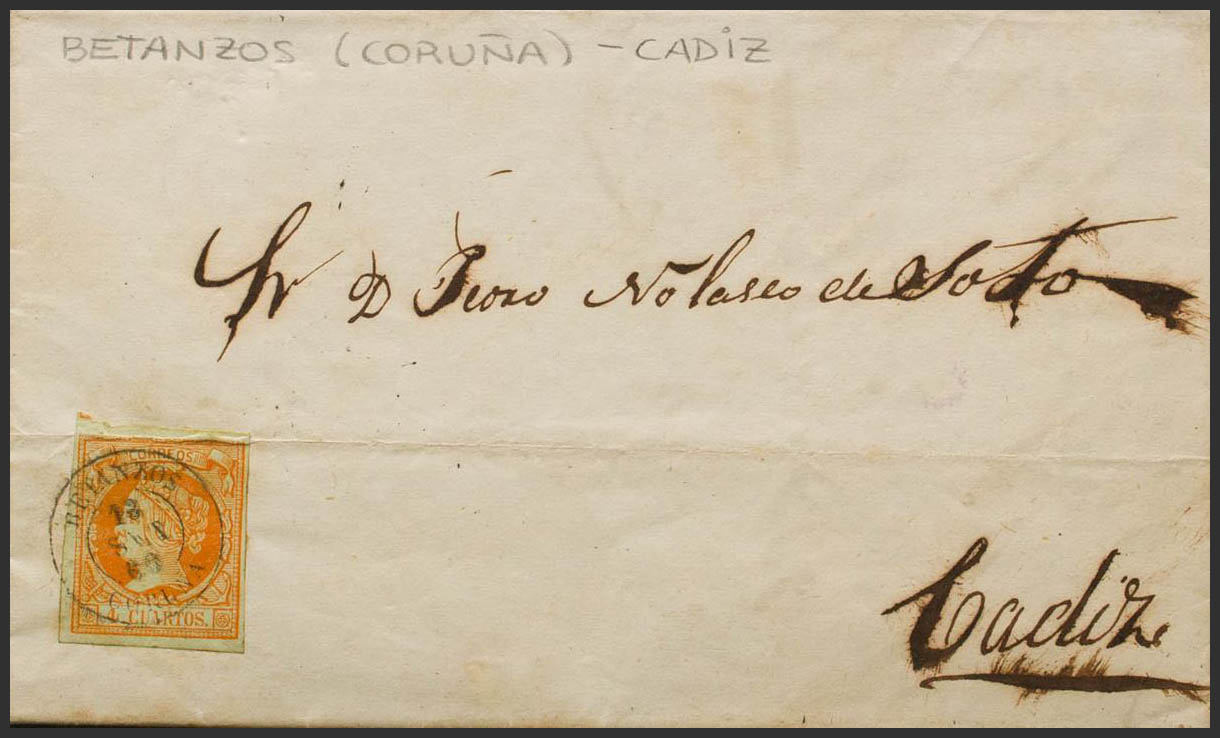 52. 1860. 4 orange cuartos . BETANZOS to CADIZ. Postmark BETANZOS / CORUÑA. PRETTY.
