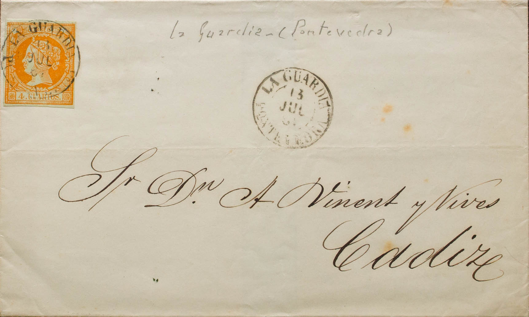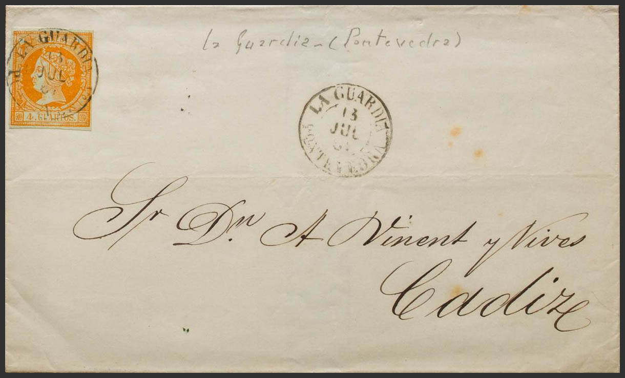 52. 1861. 4 orange cuartos . THE GUARD to CADIZ. Postmark LA GUARDIA / PONTEVEDRA (Type I). MAGNIFICENT.
