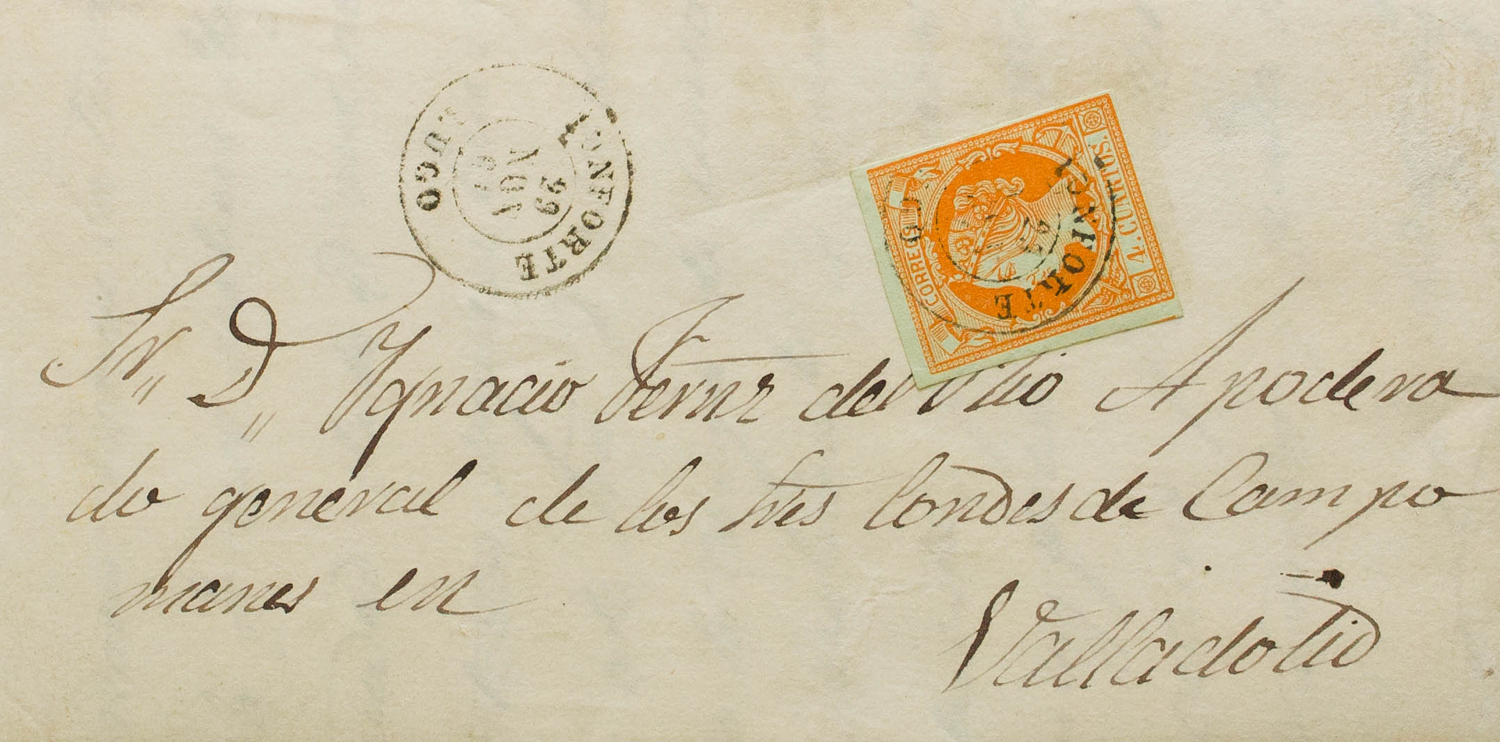 52. 1861. 4 orange cuartos . MONFORTE to VALLADOLID. Postmark MONFORTE / LUGO. MAGNIFICENT AND RARE.