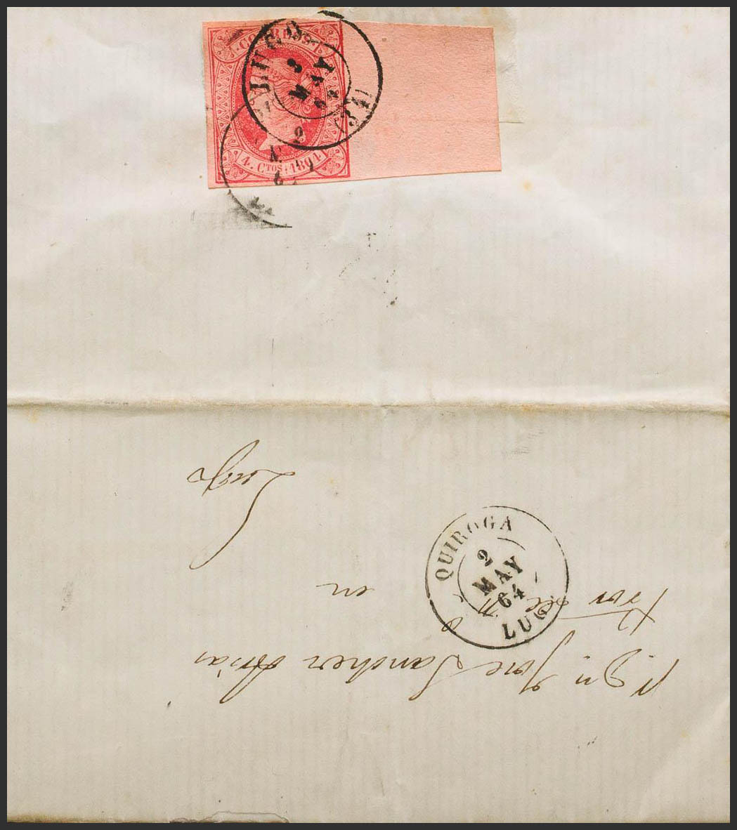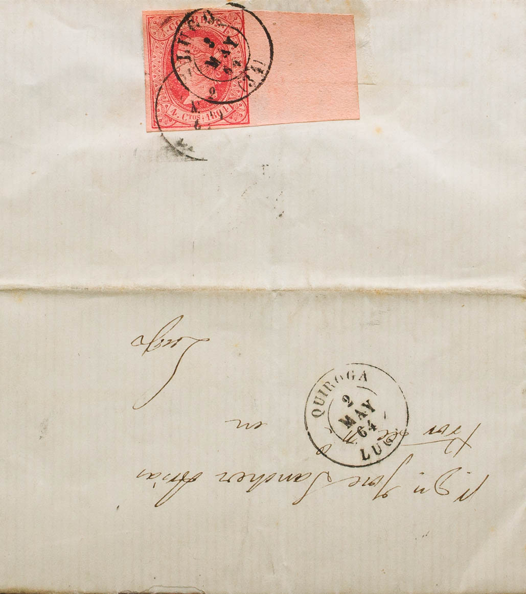 64. 1864. 4 cuartos red, sheet edge (postage on verso). QUIROGA to LUGO. Mixed postmark QUIROGA / LUGO and LUGO / (34). MAGNIFICENT AND RARE.