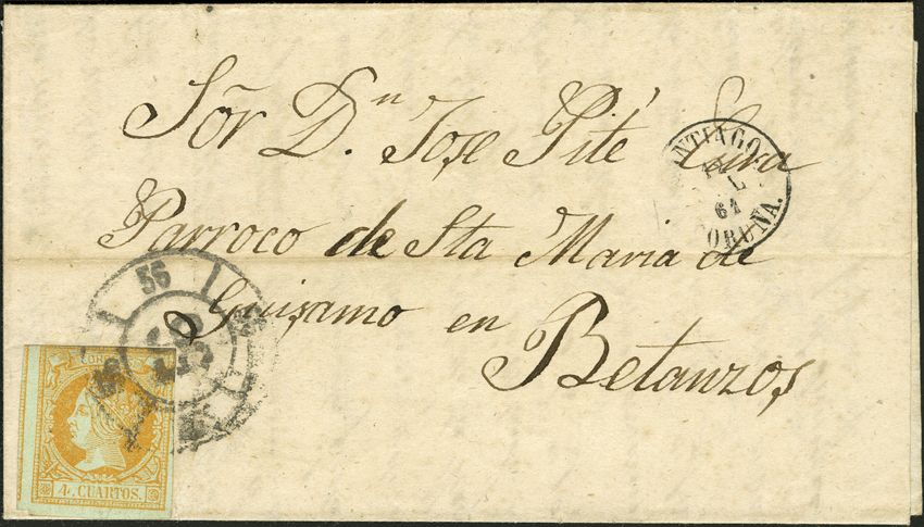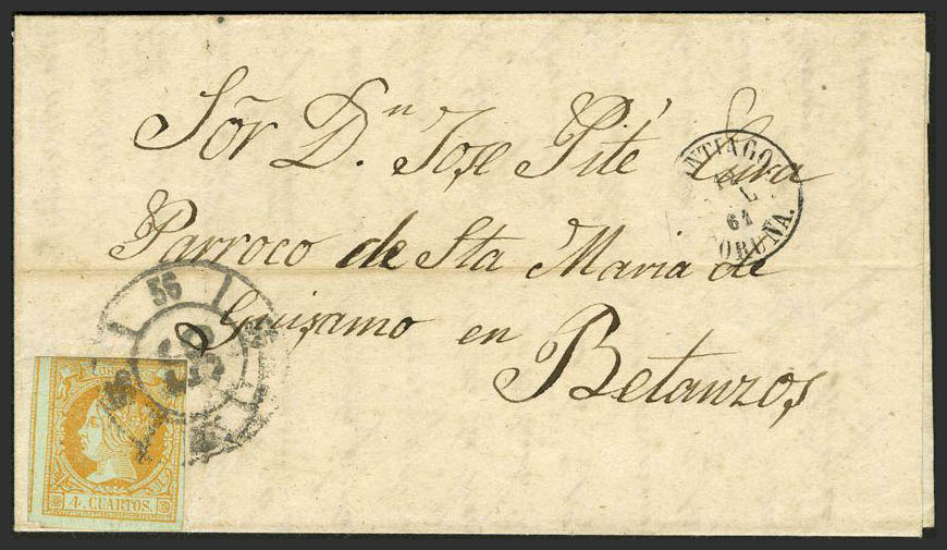 52. 1861. 4 cuartos yellow. CORUÑA to BETANZOS. Postmark R. CARRETA Nº 56.