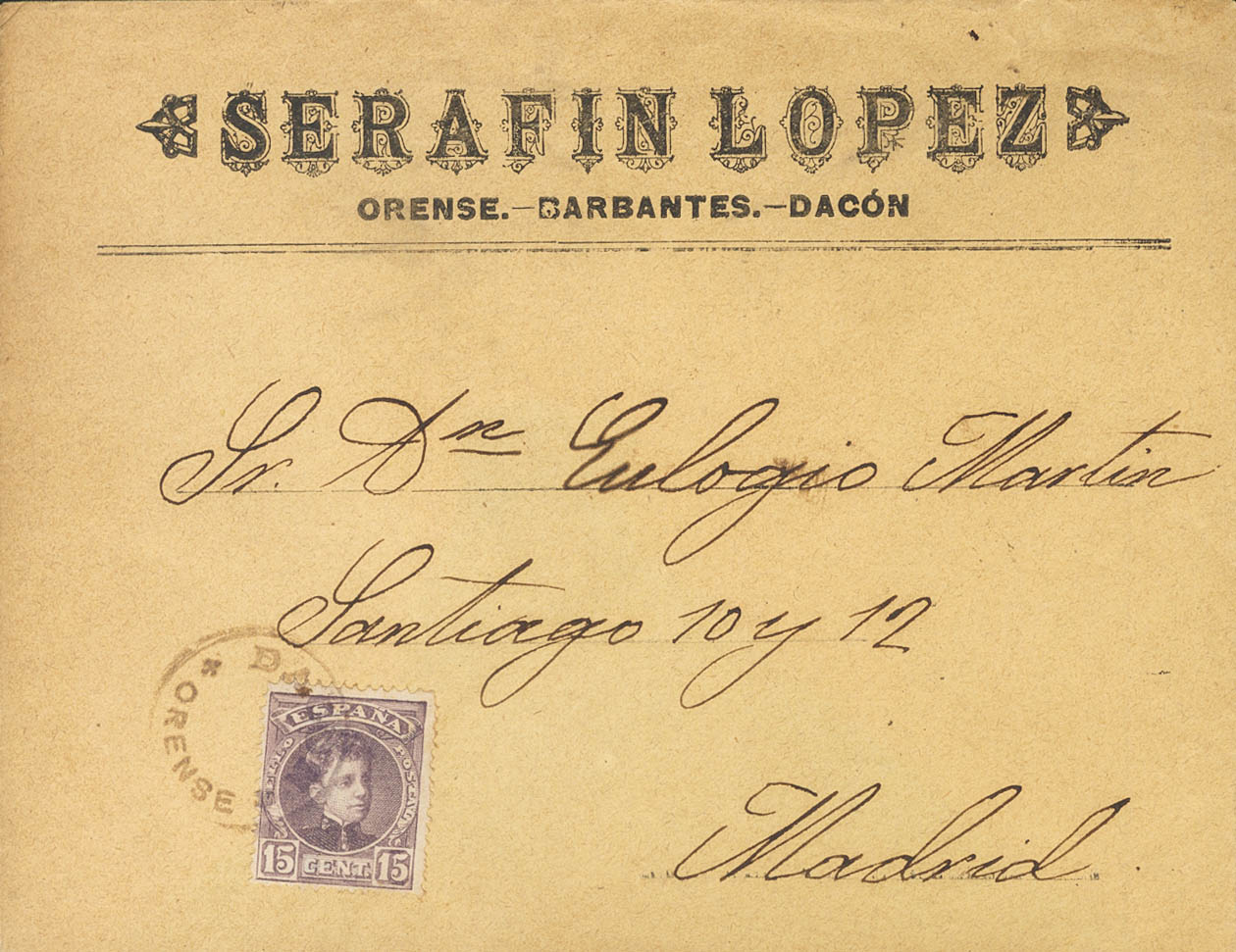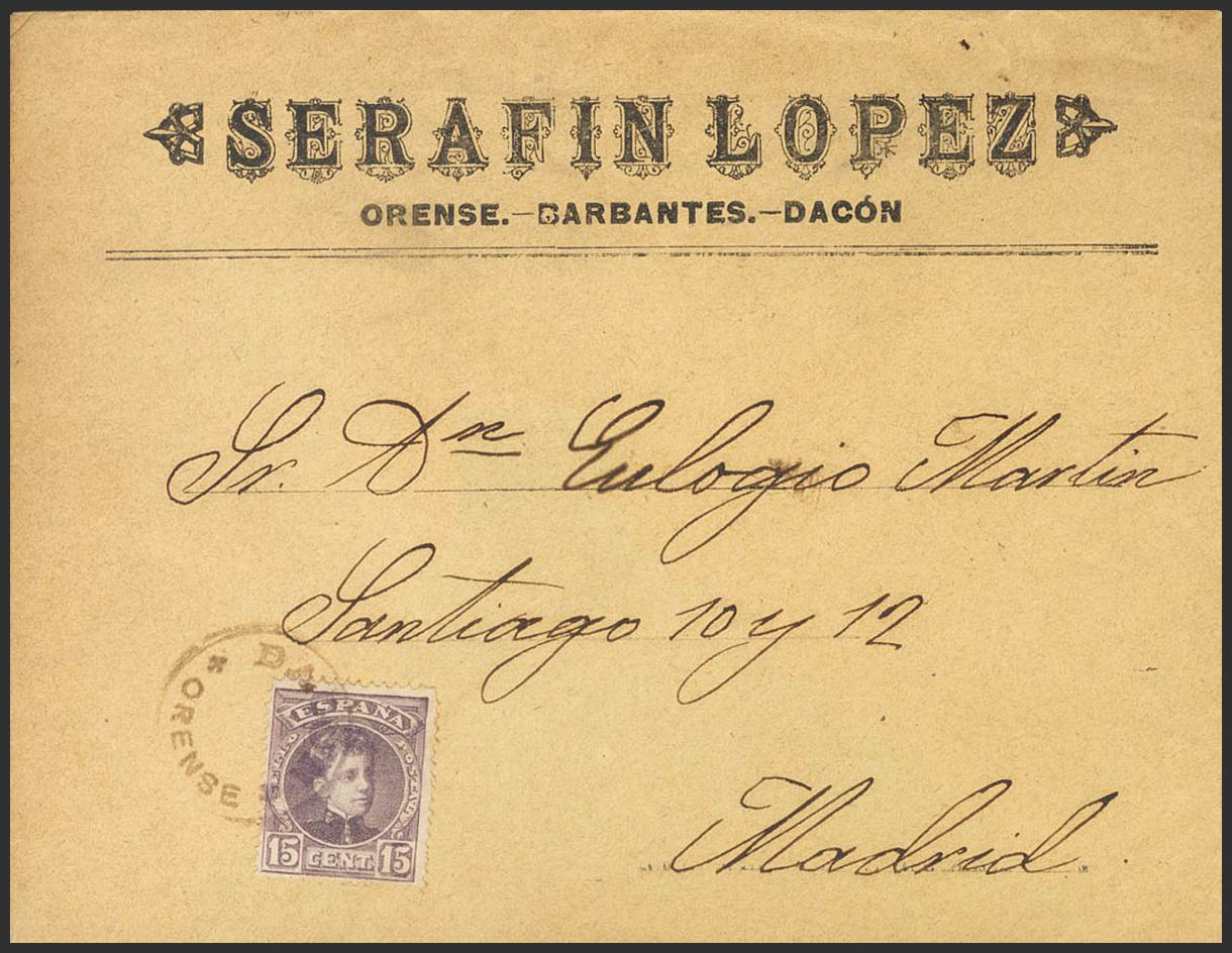 245. 1904. 15 cts chestnut lilac. DACON to MADRID. DACON / ORENSE special letter postmark, in purple. MAGNIFICENT AND RARE.