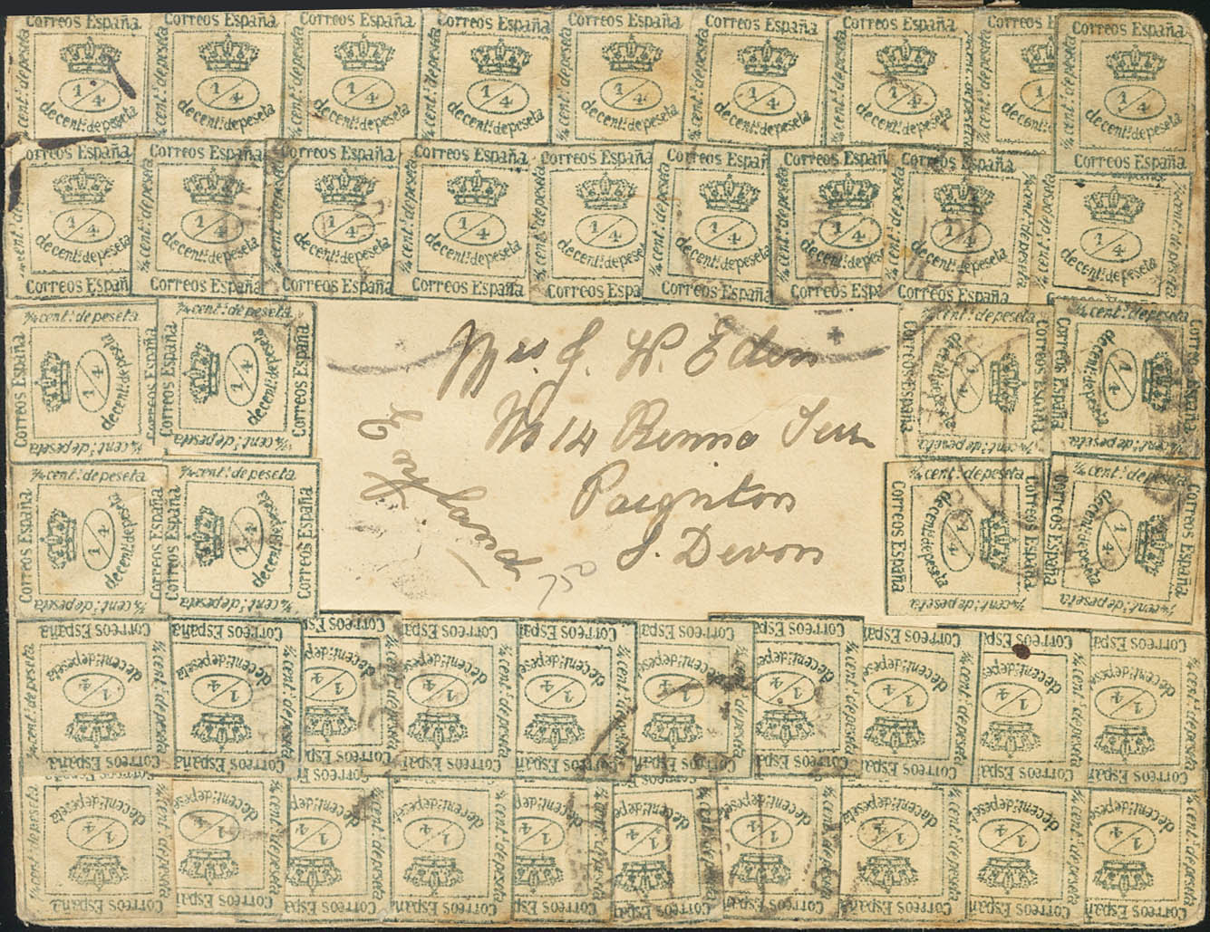 173(100). 1906. ¼ cts green, one hundred stamps (front and back). VIGO to PAINGTON (ENGLAND). Postmark VIGO / (PONTEVEDRA) and arrival on the back. MAGNIFICENT AND SPECTACULAR POSTAGE TO COMPLETE THE RATE OF 25 CTS.