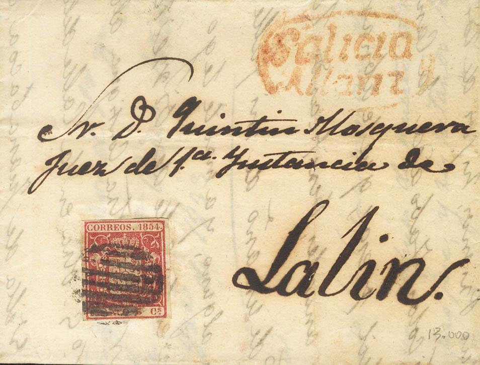 24. 1854. 6 carmine cuartos . ALLARIZ to LALIN. On the front pre-philatelic mark GALICIA / ALLARIZ, in red. MAGNIFICENT AND RARE.