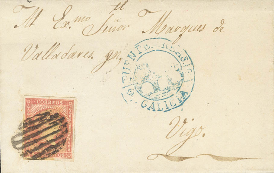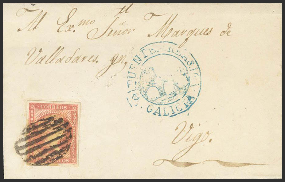 48. 1857. 4 cuartos red. SAN JUAN DE FORNELOS to VIGO. On the front pre-philatelic mark PUENTEAREAS / GALICIA, in blue. MAGNIFICENT AND RARE.
