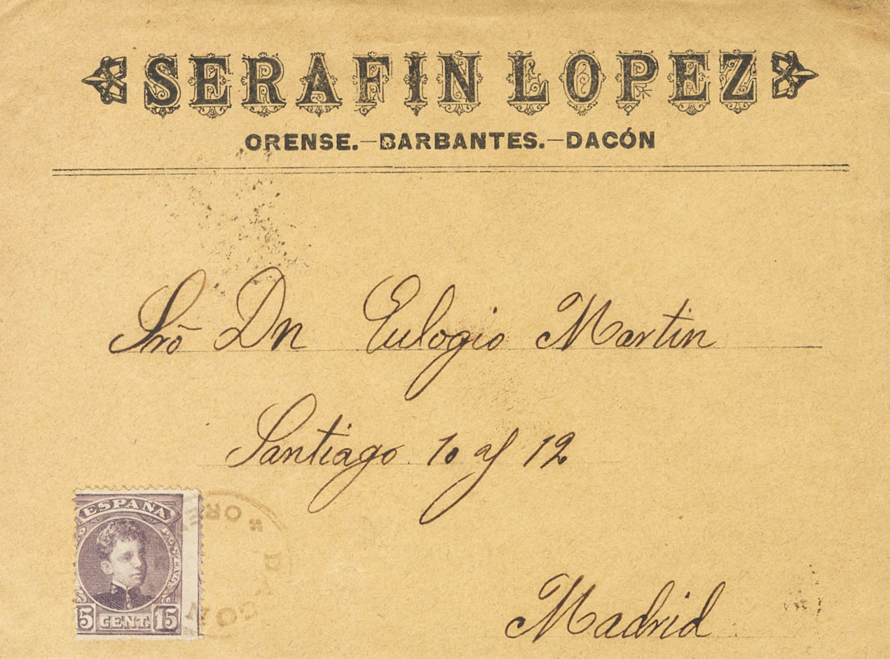 245. 1904. 15 cts chestnut lilac. DACON to MADRID. DACON / ORENSE special postage circular postmark. MAGNIFICENT AND RARE.