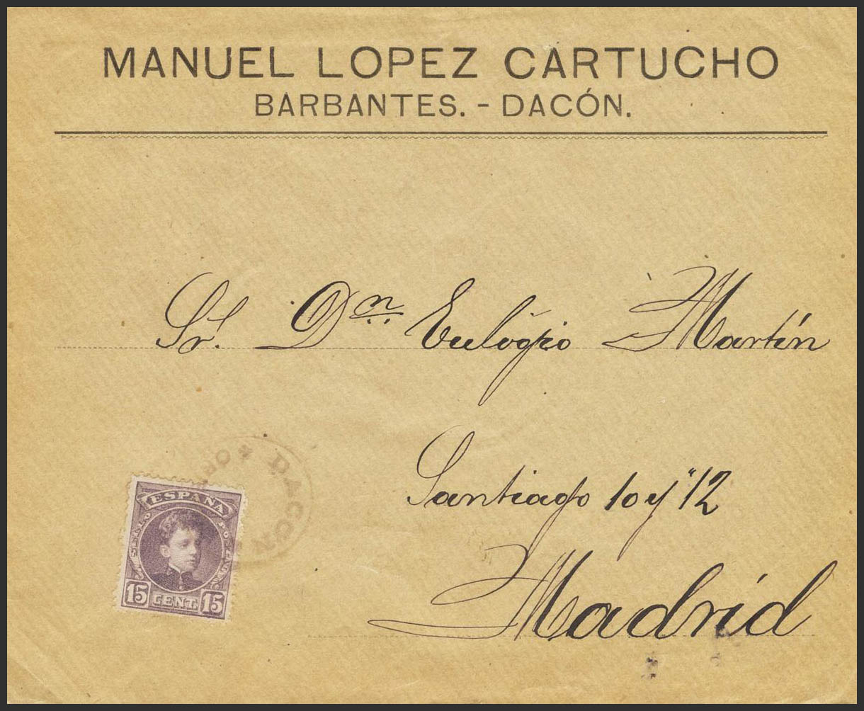 245. 1904. 15 cts chestnut lilac. DACON to MADRID. DACON / ORENSE special postage circular postmark. MAGNIFICENT AND RARE.