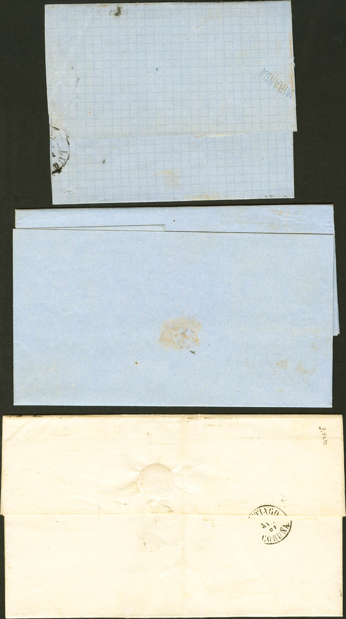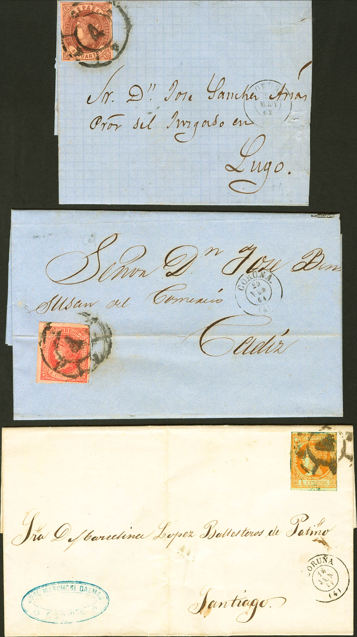 52, 58, 64. (1860ca). Set of three letters circulated with the 4- cuartos yellow, brown and pink stamps from LA CORUÑA to SANTIAGO, LUGO and CADIZ, respectively and unused with the postmark R.CARRETA Nº4, from La Coruña. MAGNIFICENT.