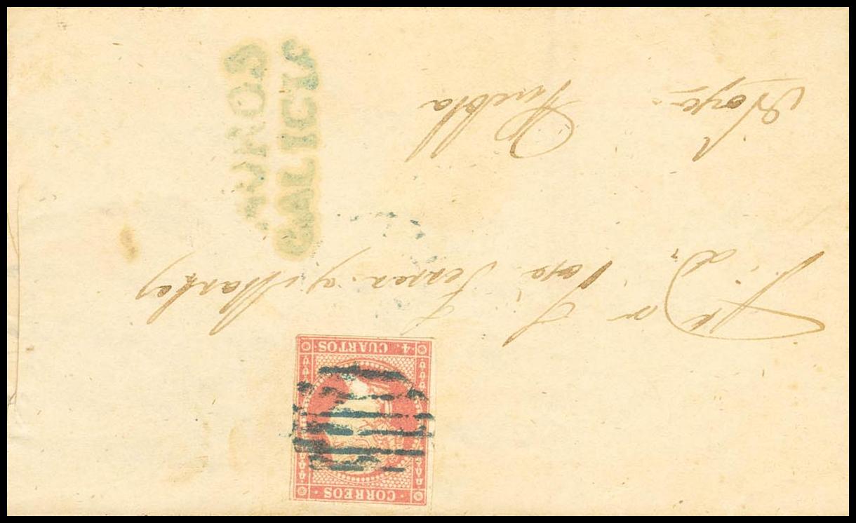 |ABOUT| 48. 1858. 4 red quarters. MUROS to PUEBLA. PARRILLA postmark and on the front pre-philatelic mark MUROS / GALICIA, both in blue. MAGNIFICENT.